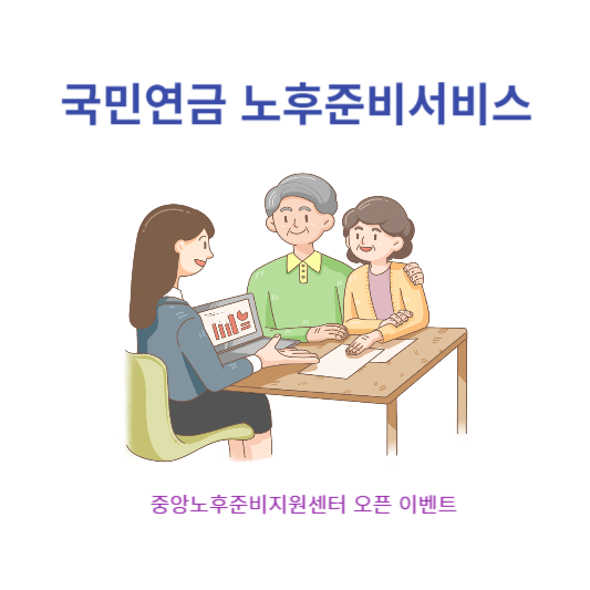 국민연금관리공단에서 중앙노후준비지원센터의 노후준비서비스를 소개합니다. 또한 국민연금공단 중앙노후준비지원센터 유튜브 채널 오픈 기념이벤트도 하니 참여하셔서 선물도 받으셨으면 좋겠습니다. 이벤트 기간은 23년 8월 21일 ~ 9월 3일(일)까지입니다. 노후준비서비스 개시 알아보시면서 이벤트 참여도 하셔서 선물 받아가심 좋을 것 같습니다.