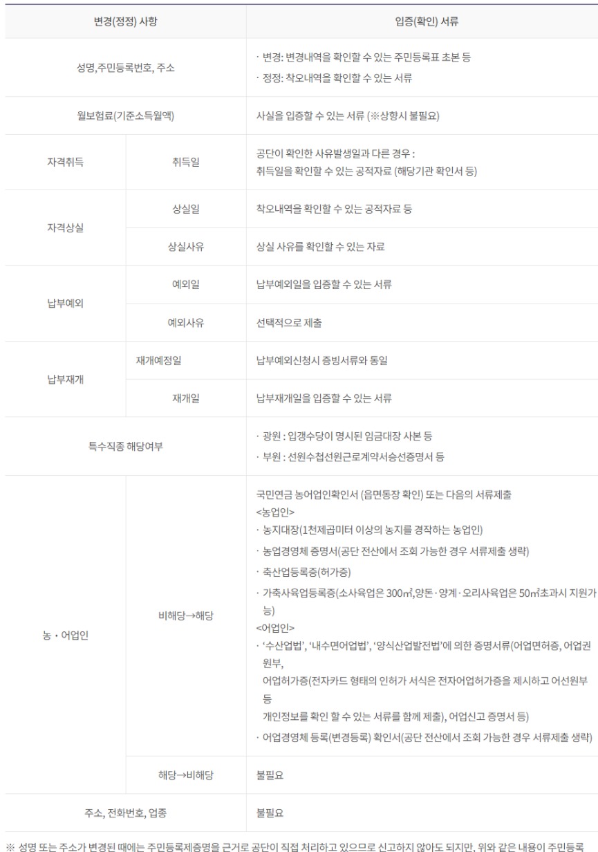 ※ 성명 또는 주소가 변경된 때에는 주민등록제증명을 근거로 공단이 직접 처리 함.